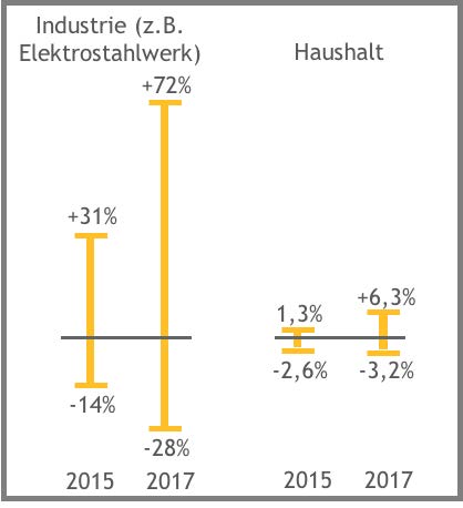 Für einen Haushalt mit einem Verbrauch von 3.500 kWh pro Jahr stiegen die Übertragungsnetzentgelte im Jahr 2017 um bis zu 6,3 Prozent in den Netzgebieten von Amprion und TransnetBW während in den anderen Übertragungsnetzen mit einem Rückgang um bis zu 3,2 Prozent zu rechnen wäre. Industriekunden auf Höchstspannungsebene würden um bis zu 72 Prozent stärker belastet bzw. um bis zu 28 Prozent entlastet.