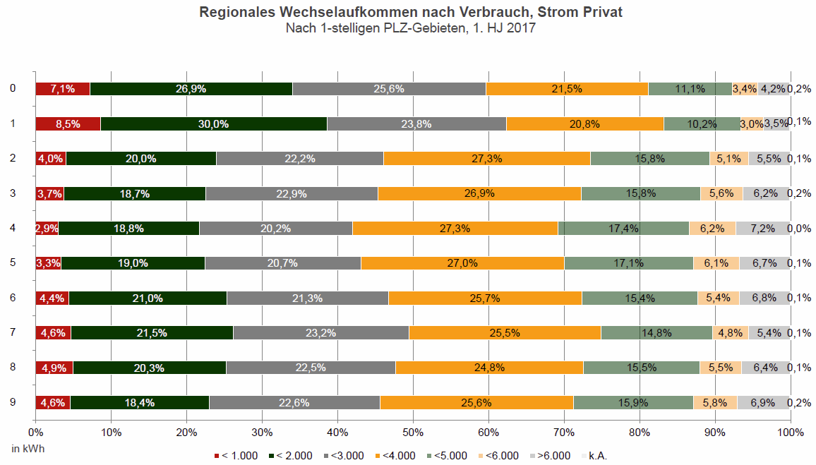 Die Wechselneigung und das Wechselverhalten sind jedoch regional sehr unterschiedlich, wie die aktuelle Wechslerstudie Energie 1. HJ 2017 von Verivox und Kreutzer Consulting aufzeigt. So wiesen im 1. Halbjahr 2017 bspw. im PLZ-Gebiet 1 60% der Wechsler, die den Vertrag beim neuen Anbieter über Verivox abgeschlossen haben, einen Jahresstromverbrauch von weniger als 3.000 kWh. Im PLZ-Gebiet 4 verbrauchten hingegen 60% mehr als 3.000 kWh (siehe Grafik).