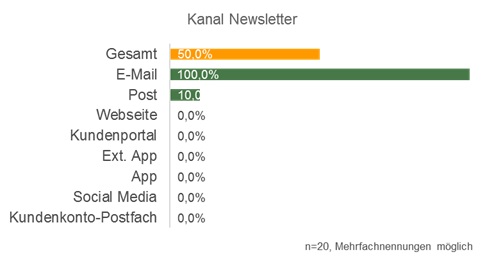 Diejenigen Versorger, die einen Newsletter anbieten, verschicken diesen in allen Fällen per E-Mail. Ein Versorger versendet den Newsletter zusätzlich per Briefpost. Andere Formen der Bereitstellung werden nicht genutzt. Dies zeigt, dass die technischen Möglichkeiten der Newsletter-Bereitstellung noch längst nicht ausgereizt sind.