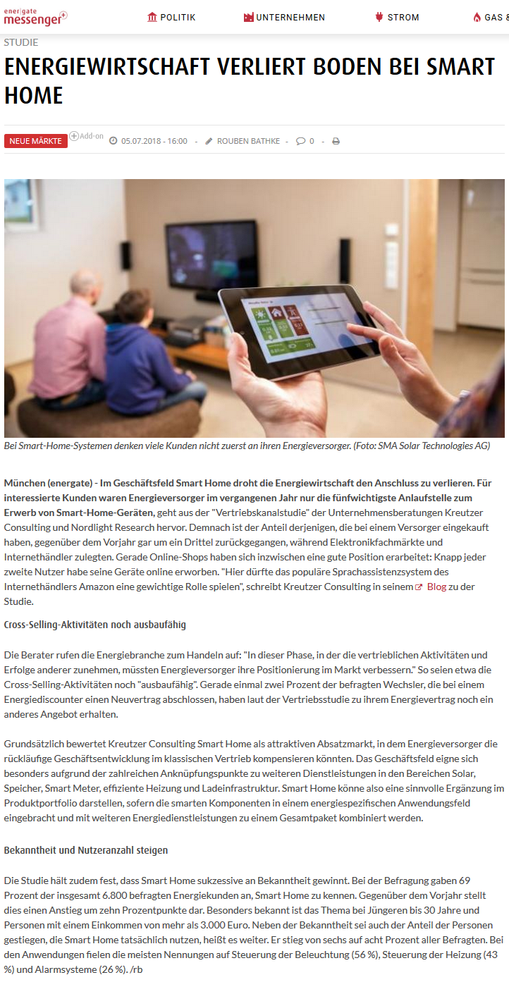 Artikel über die Ergebnisse der Vertriebskanalstudie Energie 2018 im Branchen-Nachrichtendienst "energate messenger", 05.07.2018. Link zum Artikel.