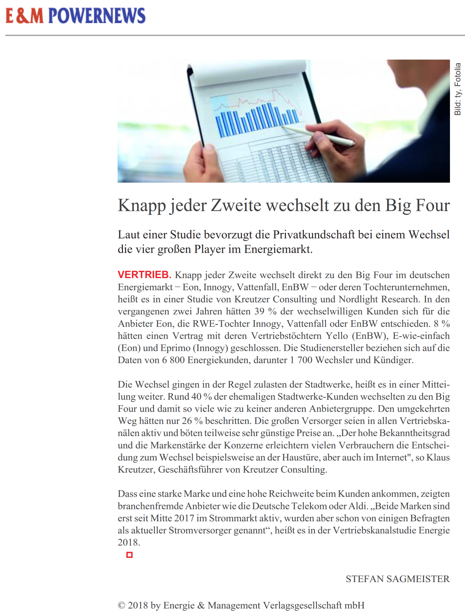 Artikel über die Ergebnisse der Vertriebskanalstudie Energie 2018 im Branchenzeitung "Energie & Management", 05.07.2018. Link zum Artikel.