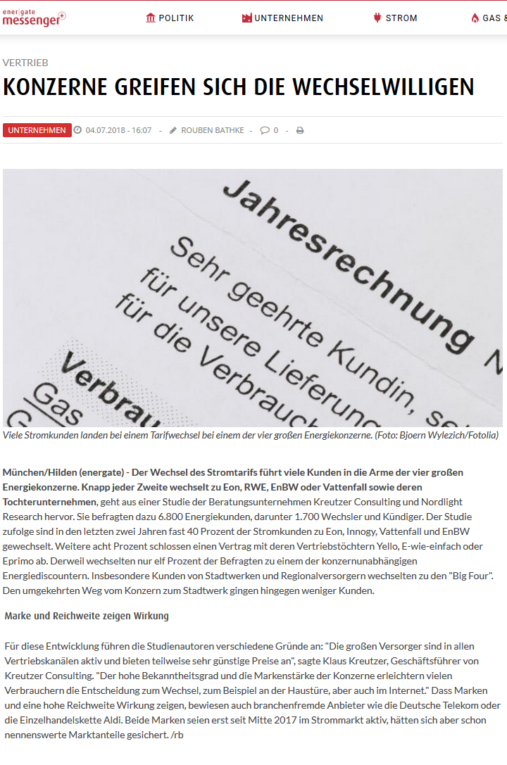 Artikel über die Ergebnisse der Vertriebskanalstudie Energie 2018 im Branchen-Nachrichtendienst "energate messenger", 04.07.2018. Link zum Artikel.
