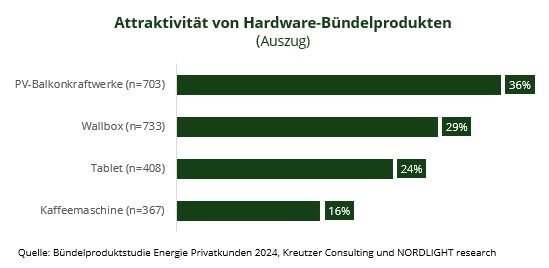 Besonders auffällig ist, dass vor allem Produkte ohne direkten Bezug zur Energieversorgung an Attraktivität verlieren. Während energieferne Hardware-Bündelprodukte vor wenigen Jahren noch häufig zur Kundengewinnung eingesetzt worden sind, lässt sich aktuell mit Tarif-Bündeln oder Bündelprodukten mit Energiedienstleistungen mehr Potential heben.
