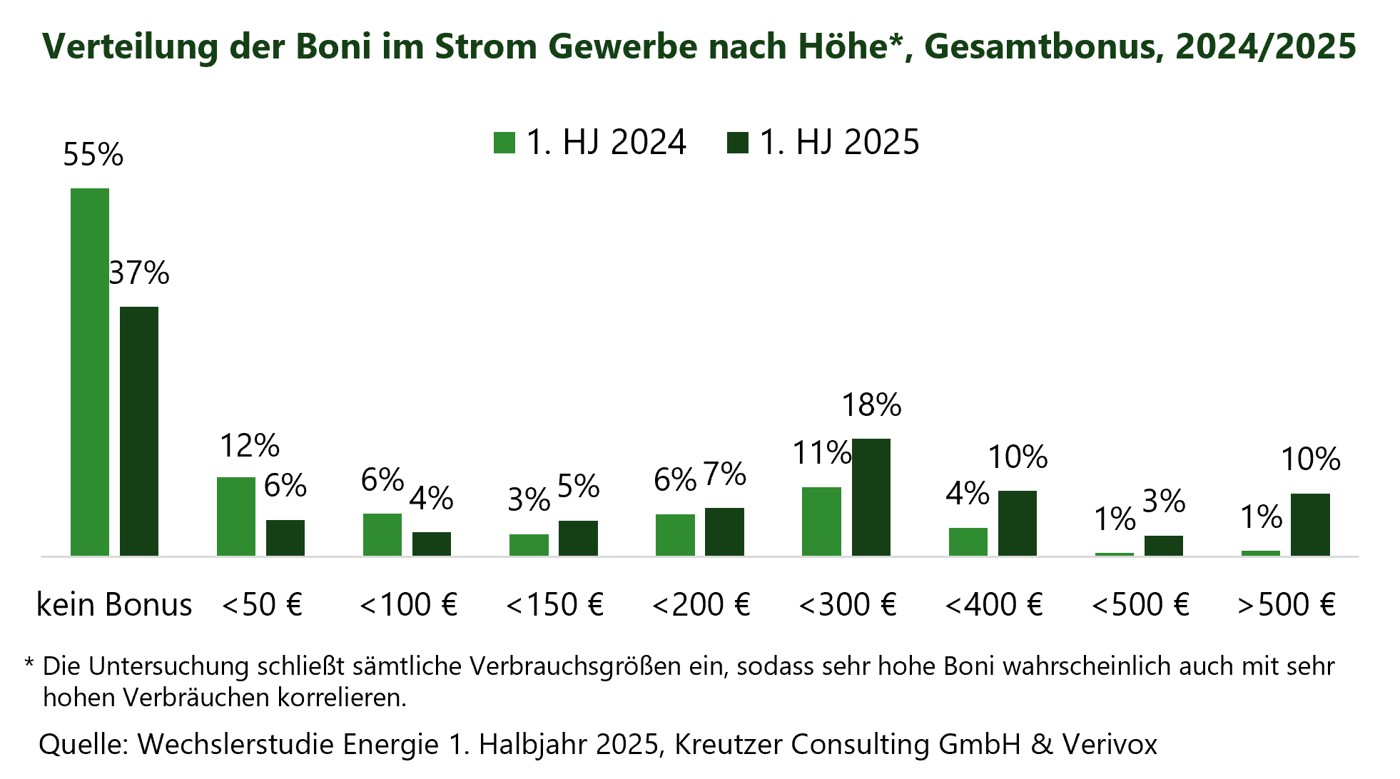 Im 1. Halbjahr 2025 haben Gewerbewechsler deutlich häufiger Stromtarife mit Bonus gewählt. Der Anteil stieg gegenüber dem Vorjahr von 45 auf 63 %. Verschiebungen zeigen sich auch bei der Bonushöhe.