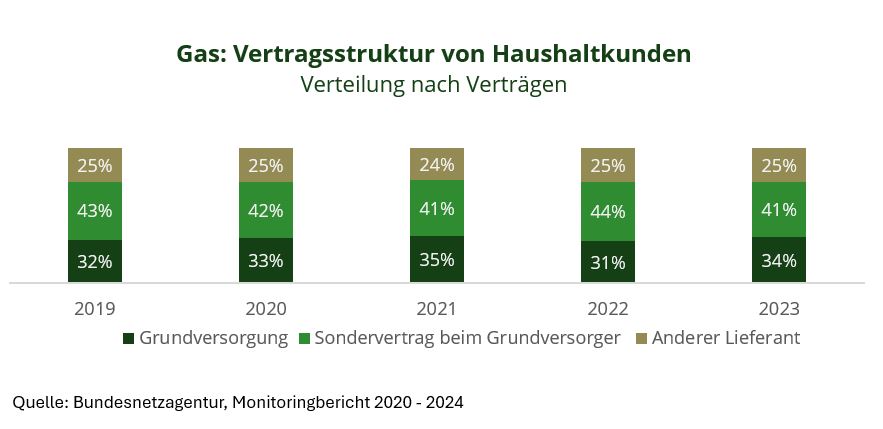 Im Gasmarkt ist hingegen eine teils andere Entwicklung zu beobachten: im Vergleich zu 2022 ist der Marktanteil von Sonderverträgen bei Grundversorgern 2023 zwar ebenfalls um drei Prozentpunkte gesunken. Seit 2019 ist die Quote von Sonderverträgen von Grundversorgern mit knapp 5 % jedoch nur halb so stark gesunken. Der Anteil grundversorgter Kunden ist hingegen seit 2019 mit etwa 6 % fast doppelt so stark gestiegen wie im Strom. Der Marktanteil anderer Lieferanten ist seit 2019 weitgehendst stabil geblieben.