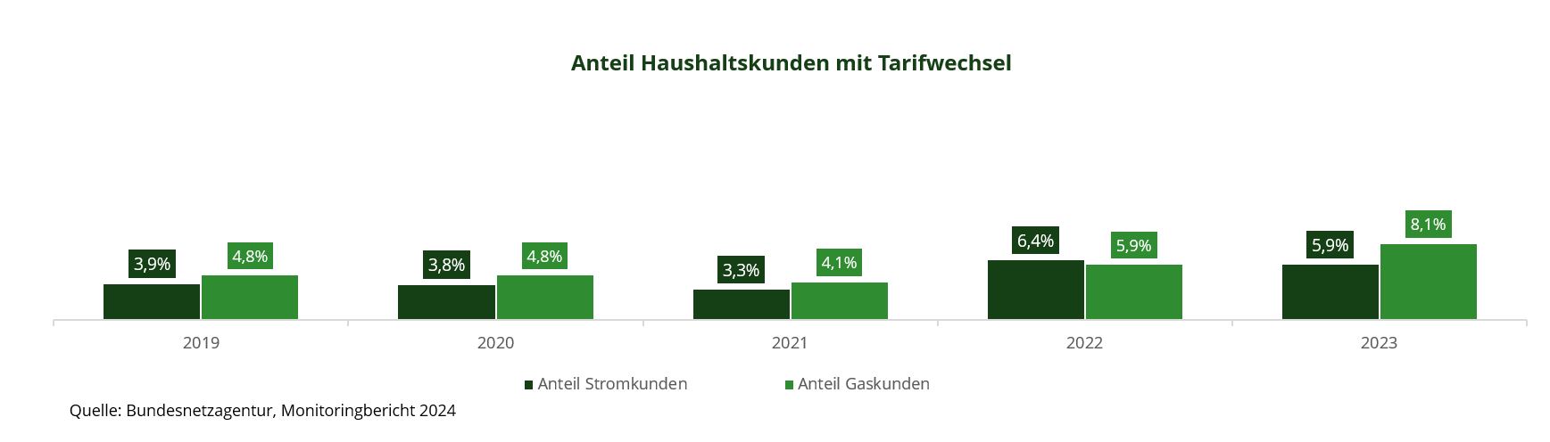 Im Gas zeigt sich die Entwicklung der Tarifwechsel noch stärker: von 2022 auf 2023 war eine Zunahme um 2,2 Prozentpunkten zu beobachten. Die Quote hat seit 2019 um knapp 69 % zugenommen.