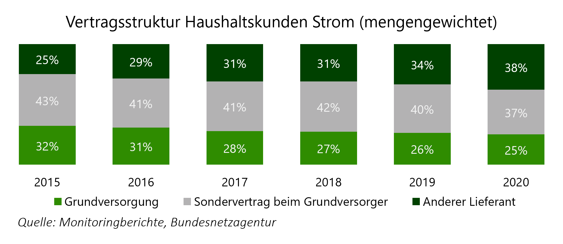 Spannend bleibt jedoch, wie sich die Marktanteile im Jahr 2021 entwickeln werden. Durch die aktuelle Preisentwicklung bieten die Grundversorger häufig günstigere Tarife an als die übrigen Anbieter. Es liegt daher die Vermutung nahe, dass die Marktanteile der Grundversorger in 2021 stabil bleiben, vielleicht sogar leicht steigen werden.