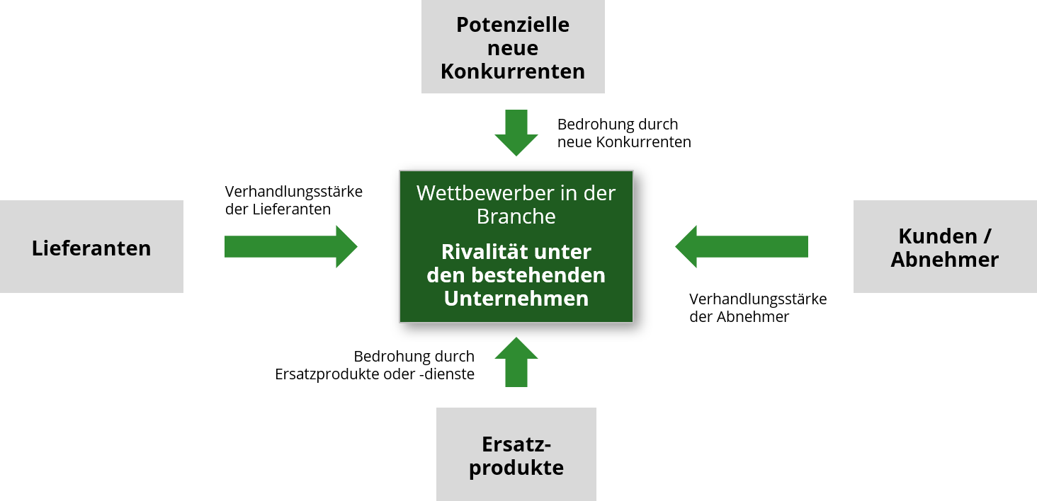 Um ein vollständiges Verständnis der relevanten Branche und des Marktumfelds zu bekommen – sei es bspw. für den Eintritt in einen neuen Markt oder die Erweiterung der Produktpalette – sollte eine Branchenstrukturanalyse durchgeführt werden. Mit dieser kann die Attraktivität einer Branche im Hinblick auf das eigene Unternehmen bewertet werden. Die Analyse basiert meist auf dem Five-Forces-Modell von Porter. Die Ergebnisse können anschließend u.a. in eine SWOT-Analyse einfließen. Untersucht werden z.B. folgende Indikatoren:
