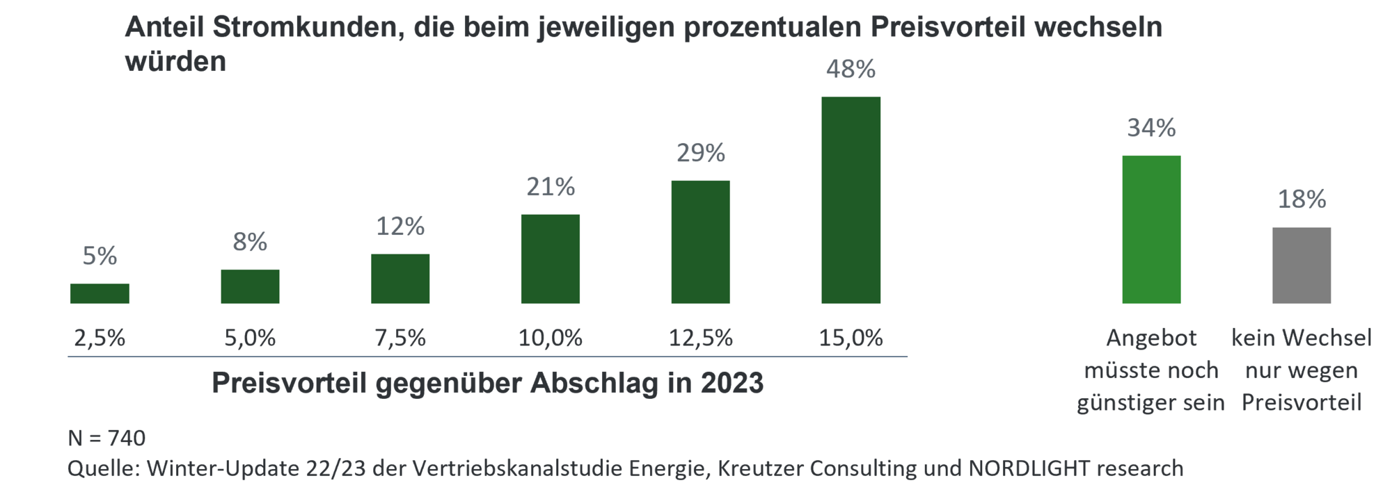 21% der Stromkunden würden bei einem Preisvorteil von 10% einen erneuten Wechsel vornehmen. Für 48% müsste der Preisvorteil 15% betragen und 34% gaben an, dass das Angebot noch günstiger sein müsste. Im Gasmarkt liegen die Preisschwellen höher.