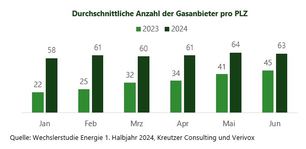 Im ersten Halbjahr 2024 waren auf Verivox durchschnittlich 61 Gasanbieter pro Postleitzahl verfügbar, was im Vergleich zum Vorjahreszeitraum einen Anstieg um rund 85 Prozent darstellt. Auch im Stromsegment war mit 98 Anbieter pro PLZ im ersten Halbjahr 2024 eine deutliche Zunahme um 41 Anbieter bzw. um rund 72 Prozent gegenüber dem ersten Halbjahr 2023 zu verzeichnen. Dies geht aus der neuen Wechslerstudie Energie 1. Halbjahr 2024 von Kreutzer Consulting und Verivox hervor.